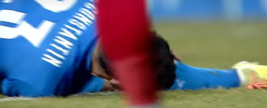 Imediat după, oltenii au cerut penalty. Marius Constantin a acuzat minute bune intrarea dură a lui Iacob, care l-a lovit peste tibie. Mai mult, fostul jucător al Rapidului a rămas cu jambiera ruptă, în urma duelului.