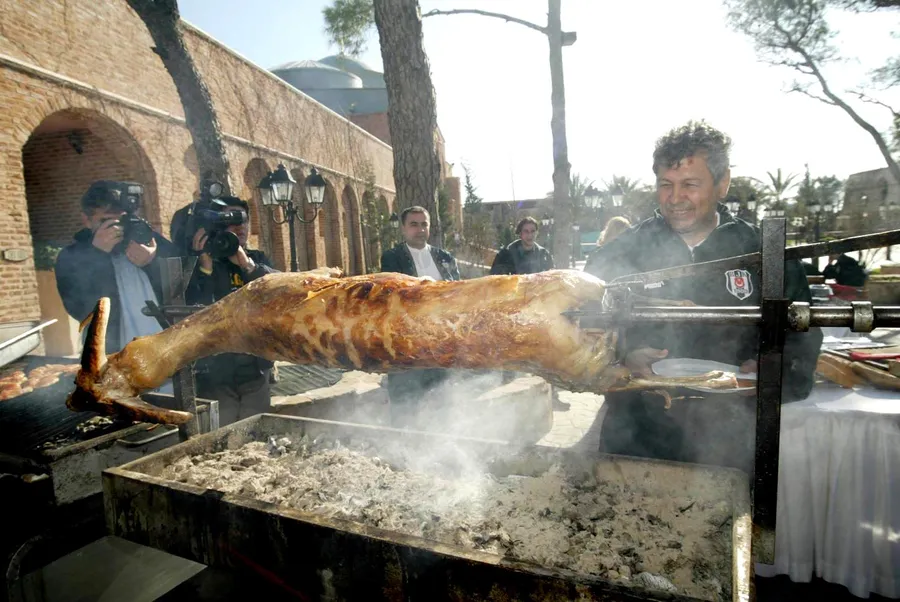 Imaginea de mai sus ni-l aduce pe Mircea Lucescu în ianuarie 2003, jovial și în fața… unei capre la proțap! Se întâmpla în cantonamentul echipei pe care o pregătea atunci, Beșiktaș Istanbul, tehnicianul deschizând practic, cot la cot cu fotbaliștii lui, ospățul special. Turcii se aflau în stagiu de pregătire în Antalya, cazați la hotelul World of Wonders Topkapi Palace.