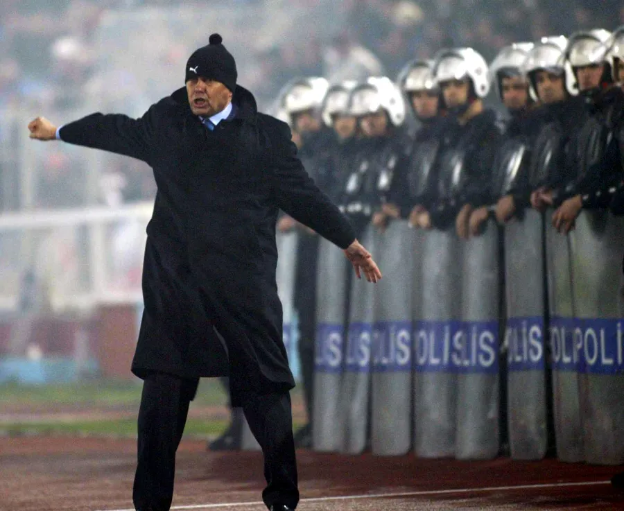 Momentul a fost surprins în timpul partidei Trabzonspor – Beșiktaș 1-1 din martie 2003, iar știută fiind atmosfera extrem de ostilă a celor de la Trabzon față echipele din capitala Turciei, se explică și cordonul impresionant de forțe de ordine, cu căști și scuturi, din spatele lui Mircea Lucescu! Furios pe o fază din teren, antrenorul român pare însă, întâmplător, să dea parcă semnalul asediului final spre o cetate nebănuită!