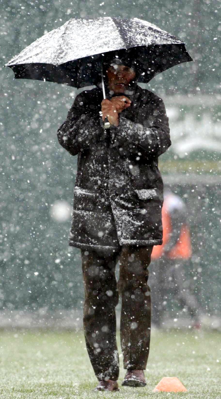 Mircea Lucescu la un simplu antrenament al celor de la Beșiktaș Istanbul. Ar fi putut să se menajeze. Să se ascundă pe undeva, măcar. Dar merge prin lapoviță și frig, cu gulerul ridicat, cu umbrela deformată de vântul aprig. Tot înainte, pe drumul său de antrenor, până la capăt devotat total profesiei, misiunii și fotbalului.