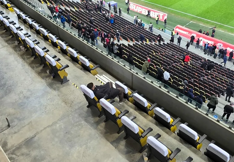 Acesta pur și simplu a încremenit în scaun, a rămas cu privirea pierdută spre teren și, minute bune, aproape un sfert de oră, a rămas singur fără să schițeze vreun gest până când voluntarii începuseră deja să strângă capișoanele de pe spătarul fotoliilor.