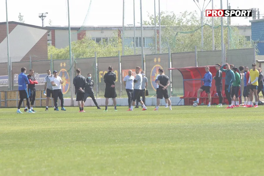 Jucătorii din lotul vicecampioanei României au fost strânși în cerc, dar membrii din staff-ul lui Bogdan Argeș Vintilă au purtat măști de protecție și au stat la o distanță destul de mare de fotbaliștii de la FCSB.