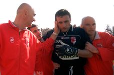 Doctorul Bătineanu, stânga, îi acordă îngrijiri medicale lui Cristi Munteanu