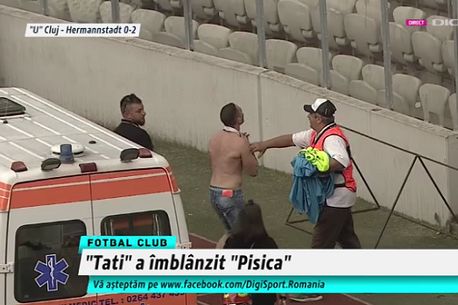 UPDATE 21:05 Jandarmul transportat de urgență la spital cu ambulanța, după ce a fost lovit cu scaunul în cap de suporteri, a fost stabilizat, conform relatărilor corespondentului ProSport. În plus, se pare că fanul care a intrat pe teren e un suporter de-al lui U Cluj, care este interzis pe stadioane, dar a fentat controlul forțelor de ordine prezente la Cluj Arena.