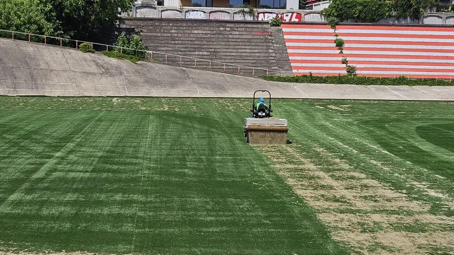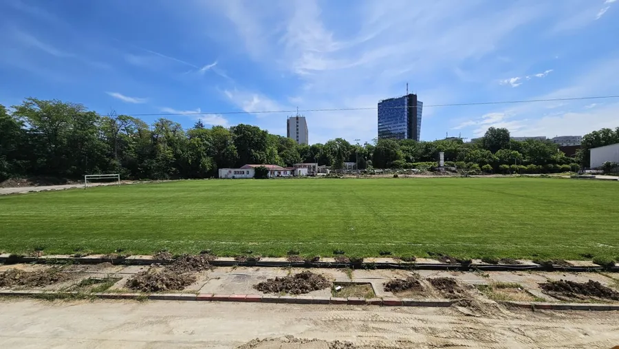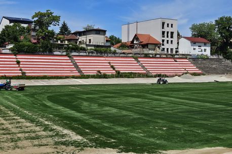 Imediat lângă construcția de beton care se află în patrimoniul cultural, terenul „Piți Varga” are deja o suprafață nouă, de data asta de iarbă 100%. Gazonul natural a fost însămânțat și, în viitorul apropiat, urmează să fie ridicat un gard care să delimiteze spațiul, tribune și instalația de nocturnă.