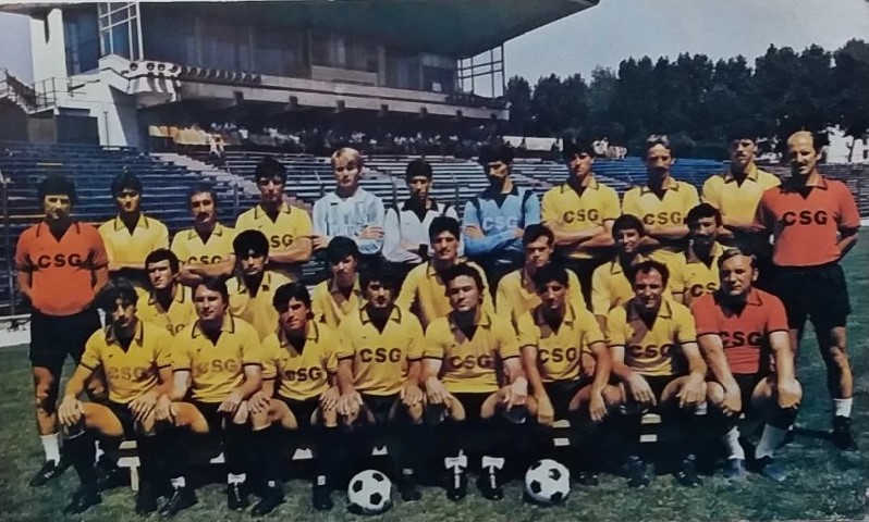 Oțelul versiune 1988, cu Cornel Dinu (mijloc, primul din stânga) pe post de antrenor principal și Sdrobiș – secund (mijloc, primul din dreapta)