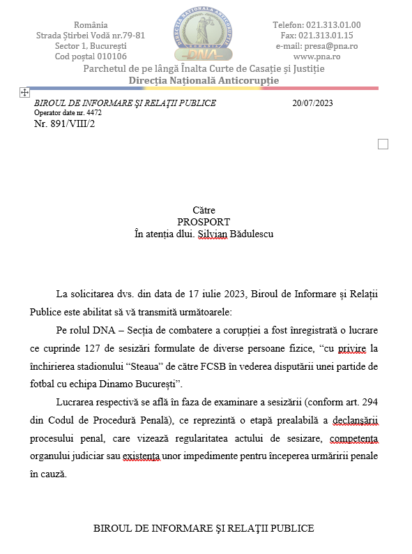 ProSport a solicitat Direcției Naționale Anticorupție, printr-un email, informații legate de respectivele plângeri. În răspunsul primit pe 20 iulie, a fost menționat un număr sub jumătatea celor 366. Răspunsul complet, mai jos (VEZI ȘI FOTO).