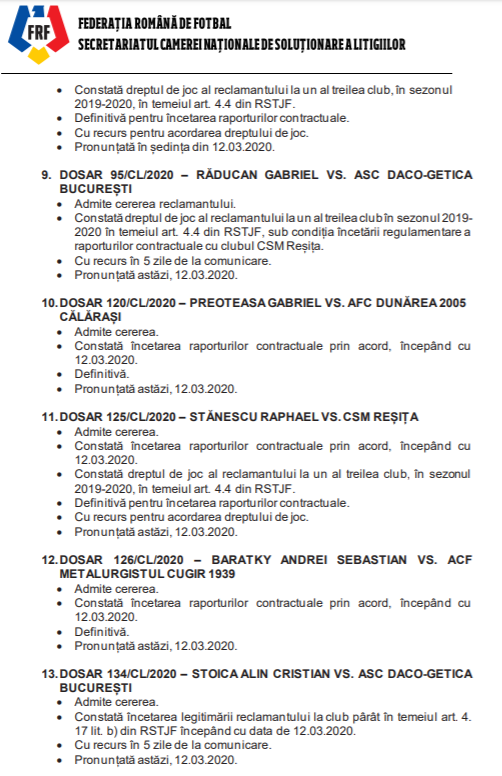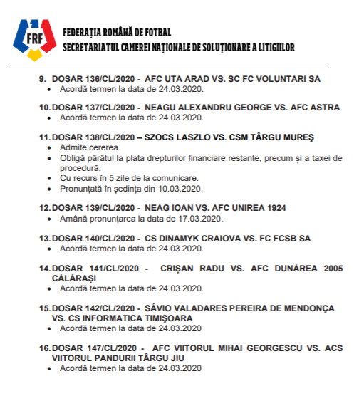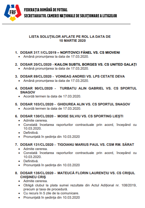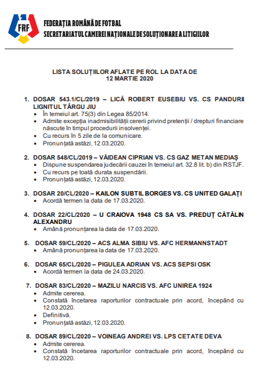 Există liste cu jucători și antrenori din ligile inferioare, din data de 10 respectiv 12 martie, care aveau de primit decizia Camerei Naționale de Soluționare a Litigiilor începând cu data de 17 martie. Exact cu o zi înainte s-a decis suspendarea acestei comisii, astfel că o parte dintre cei implicați s-au aflat în imposibilitatea de a semna noi contracte, fiind legați de fostele echipe.
