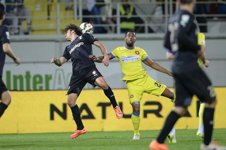 Nicandro Breeveld (în verde), duel pentru minge cu George Florescu la meciul Astra – Steaua 0-0