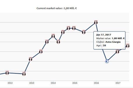 Însă Budescu este departe de cota pe care o avea în iarna lui 2015, când a atins apogeul. Atunci, internaționalul român avea o valoare aproximativ de 3 milioane de euro. Cel mai jos nivel atins în ultimii doi ani a fost în ianuarie 2016, când avea o cotă de un milion de euro. De atunci, odată cu revenirea în Liga 1, valoarea lui Constantin Budescu a început din nou să crească.