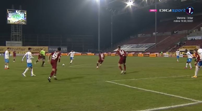 Jucătorul Craiovei a șutat necruțător, mingea a lovit transversala și a lovit rapid gazonul. Oltenii au cerut gol, dar arbitrul a făcut semn că meciul poate continua.