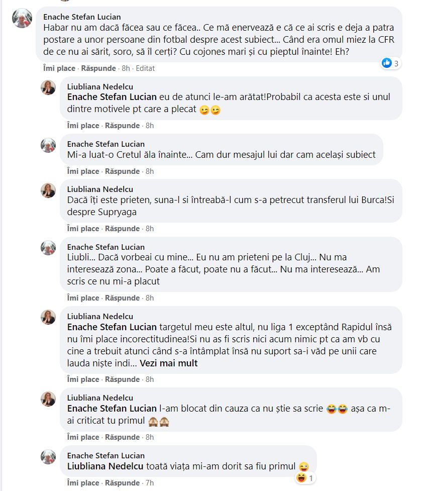 Liubliana Nedelcu: Targetul meu este altul, nu Liga 1, exceptând Rapidul, însă nu îmi place incorectitudinea! Și nu aș fi scris nici acum nimic pentru că am vorbit cu cine a trebuit atunci când s-a întâmplat, însă nu suport să-i văd pe unii care laudă niște indivizi care nu sunt corecți! l-am blocat din cauză că nu știu să scrie, așa că m-ai criticat tu primul.