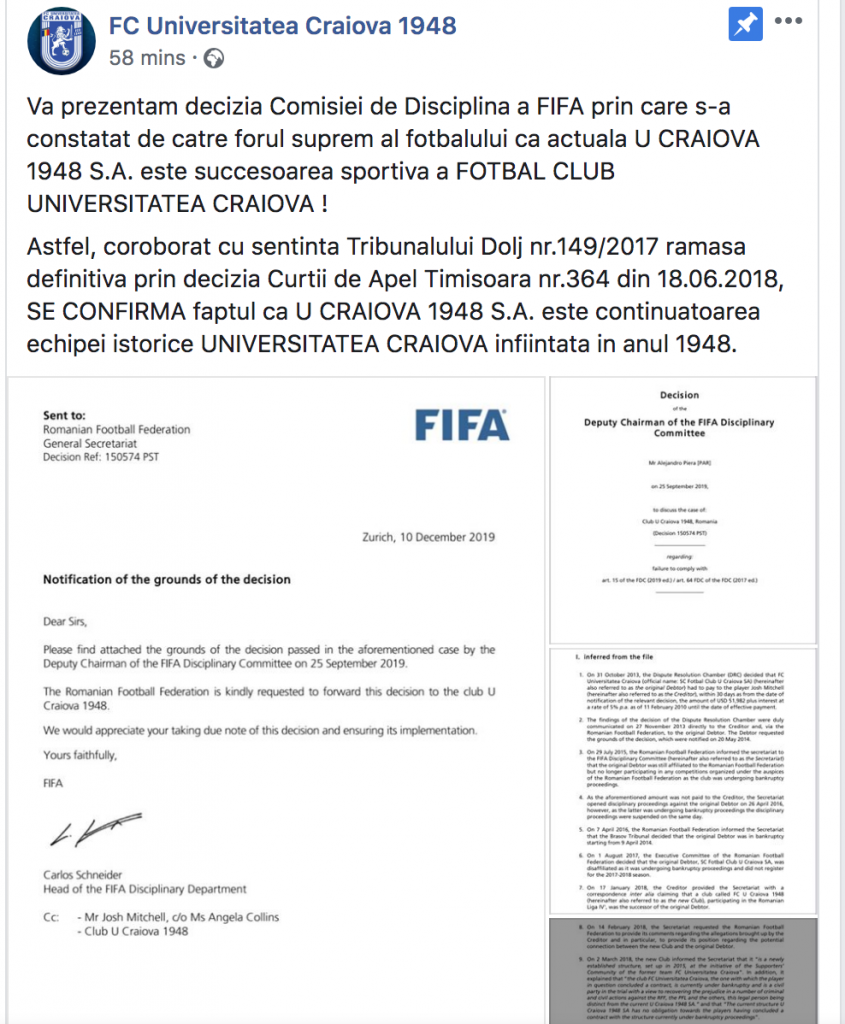 „Vă prezentăm decizia Comisiei de Disciplină a FIFA prin care s-a constatat de către forul suprem al fotbalului că actuala U CRAIOVA 1948 S.A. este succesoarea sportivă a FOTBAL CLUB UNIVERSITATEA CRAIOVA !