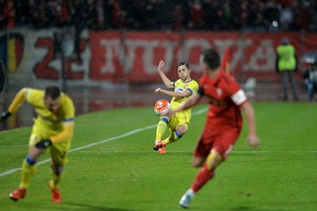 Cel mai activ flanc al campioanei în prima repriză a fost cel în care Râpă și Adi Popa au colaborat. Steliano Filip a făcut cu greu față prestației mijlocașului Stelei, poate cea mai bună din acest sezon. Foto: Mediafax