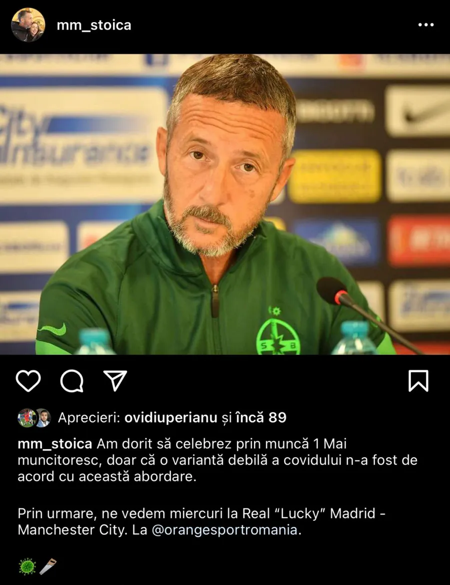 „Am dorit să celebrez prin muncă 1 Mai muncitoresc, doar că o variantă debilă a covidului n-a fost de acord cu această abordare. Prin urmare, ne vedem miercuri la Real „Lucky” Madrid – Manchester City”, se arată în mesajul postat de Mihai Stoica.