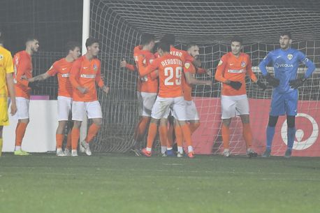 Alexandru Corban (în mijloc), de la CS Aerostar Bacau, în meciul cu FC Unirea Slobozia, disputat pe stadionul Aerostar din Bacau, 20 februarie 2021