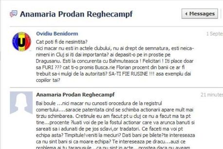 Șefa de la „U” i-a adresat suporterului cuvinte jignitoare precum „prost” sau „tâmpit” și i-a explicat în termeni nu tocmai academici meritele pe care ea le are la club. „Ce am făcut eu pentru club nu a făcut mă-ta pentru tine. Săracii dracului. M-am săturat de voi ca de mere acre„, e mesajul acesteia.