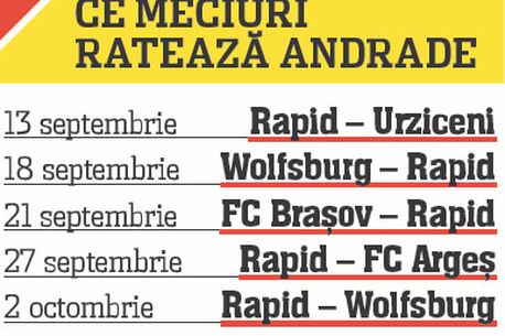 În minutul 61 al partidei cu FC Timișoara, Joa Paulo Andrade a suferit o accidentare urâtă și a părăsit terenul, fiind înlocuit cu Ovidiu Herea. Verdictul medicilor a fost unul dur: ruptură musculară la piciorul drept, iar fostul jucător al lui FC Porto va lipsi de la antrenamentele Rapidului timp de o lună! De altfel, închizătorului i-a fost aplicată o fașă ghipsată în zona afectată. Mijlocașul va mai efectua astăzi un consult medical amănunțit, dar cel mai probabil va rata dubla manșă din turul întâi al Cupei UEFA cu Wolfsburg, meciul tur urmând să aibe loc în Germania, pe 18 septembrie, în timp ce returul se va juca la București, pe 2 octombrie.