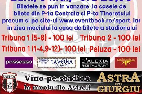 Prima partidă este cea din runda a noua, contra echipei lui Reghecampf. Meciul se va disputa luni, 8 mai, cu începere de la ora 20:30. Pentru confruntarea cu FCSB, oficialii giurgiuveni au stabilit ca prețul biletelor să fie unul fix, de 100 de lei. Este pentru a cincea oară când Astra stabilește un asemenea preț la meciurile cu roș-albaștrii.