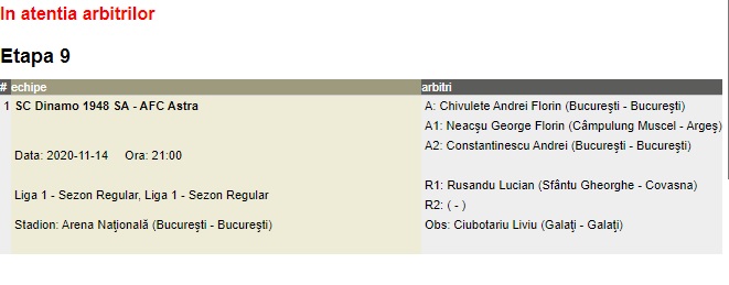 Este vorba despre etapa 9 din Liga 1. Andrei Chivulete, fiul lui Florin Chivulete, a condus meciul Chindia Târgoviște – FCSB (0-2) la data de 2 noiembrie și a fost anunțat acum pe site-ul FRF că va arbitra restanța Dinamo – Astra din data de 14 noiembrie.