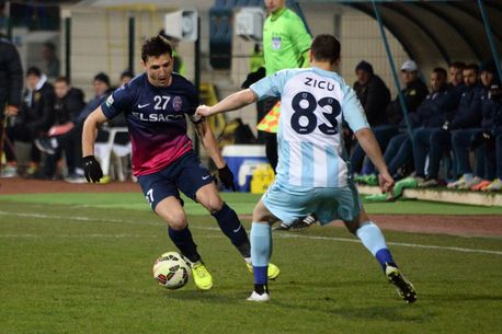 Jeremy Faugh Porret (FC Botoșani) încearcă să-l dribleze pe Ianis Zicu. Fază din meciul pe care Dinu Gheorghe a pariat pe victoria oaspeților