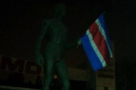 Așa s-a întâmplat și aseară, când ultrașii Stelei au mers la stadionul din Ștefan cel Mare și au montat în mâna statuii de la intrare a legendei Ivan Patzaichin un steag roș-albastru.