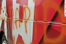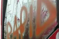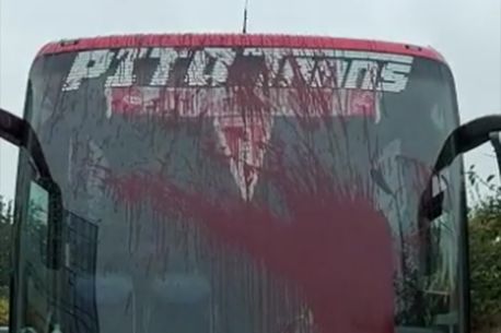 Pe folia cu care este „îmbrăcat” autocarul echipei UTA, persoane necunoscute au scris cu vopsea ”Rapid 1923”, iar o cantitate importantă de vopsea a fost aruncată pe fața și parbrizul mijlocului de transport ce i-a așteptat pe „roș-albi” duminică seara la Aeroportul din Otopeni.