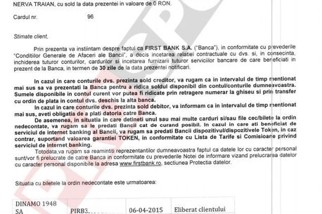„Prin prezenta vă înștiințăm despre faptul că First Bank S.A., în conformitate cu prevederile Condițiilor Generale de Afaceri ale Băncii, a decis încetarea relației contractuale cu dvs. și, în consecință, închiderea tuturor conturilor, cardurilor și încetarea furnizării tuturor serviciilor bancare de care beneficiați în prezent de la bancă, în termen de 30 de zile de la data prezentei notificări”, se arată în documentul trimis de către bancă pe adresa clubului Dinamo.