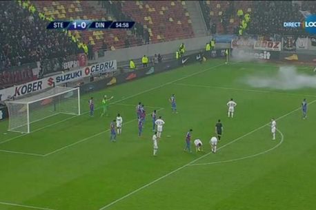 UPDATE Cu mai puțin de 10 minute rămase de jucat, și portarul Stelei a avut de suferit din cauza petardelor aruncate din tribune. Arlauskis a avut așadar nevoie de intervenția echipei medicale după ce galeria lui Dinamo, aflată în spatele porții Stelei, a trimis în teren obiecte pirotehnice.