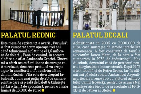Mitică de la Ligă a cumpărat recent, de la un membru al familiei Ghica, un palat pe cinste: fostul sediu al Ambasadei Spaniei, pe care a plătit nu mai puțin de 3,3 milioane de euro. „O să o modernizez, fac din ea o bijuterie și o pot vinde cu zece milioane de euro, deși, ca să fiu sincer, mi-aș dori ca acolo să locuiască nepoții mei. Sunt vecin cu Gigi Becali, dar curtea mea este mai mare și mai frumoasă“, s-a lăudat Dragomir. Palatul deputatului PRM este situat tot pe Aleea Alexandru, ca și cel al lui Gigi Becali. În cercul burghezilor din fotbalul românesc se regăsește și Mircea Rednic, care deține și el de aproape trei ani un superb imobil, situat în Bulevardul Dacia.
