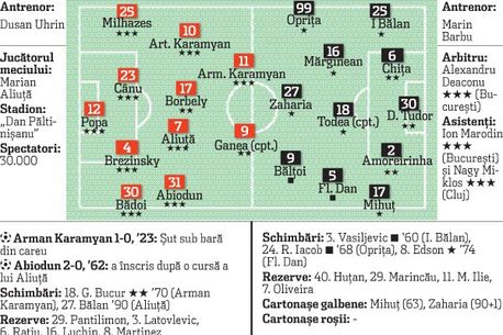 Golul marcat de Arman Karamyan în Giulești i-a dat acestuia șansa mult-așteptată de a se impune ca titular în echipa lui Poli. Cum căpitanul Ionel Ganea nu poate fi scos din echipă, Gigel Bucur a fost sacrificat de Dusan Uhrin. „Fratele” nu a dezamăgit și a marcat primul gol al lui Poli, la o fază plecată de la centrarea excelentă trimisă de Artiom Karamyan. (Dan JAKABHÁZI)