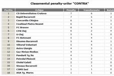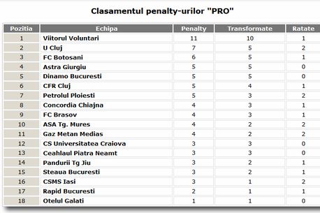 Echipa care a provocat cele mai multe lovituri de la 11 metri este CS U Craiova – 7, Rapid – 7 și Concordia Chiajna – 6. La polul opus se află Steaua, CSMS Iași și ASA Târgu Mureș, cu câte un penalty dictat împotriva lor.