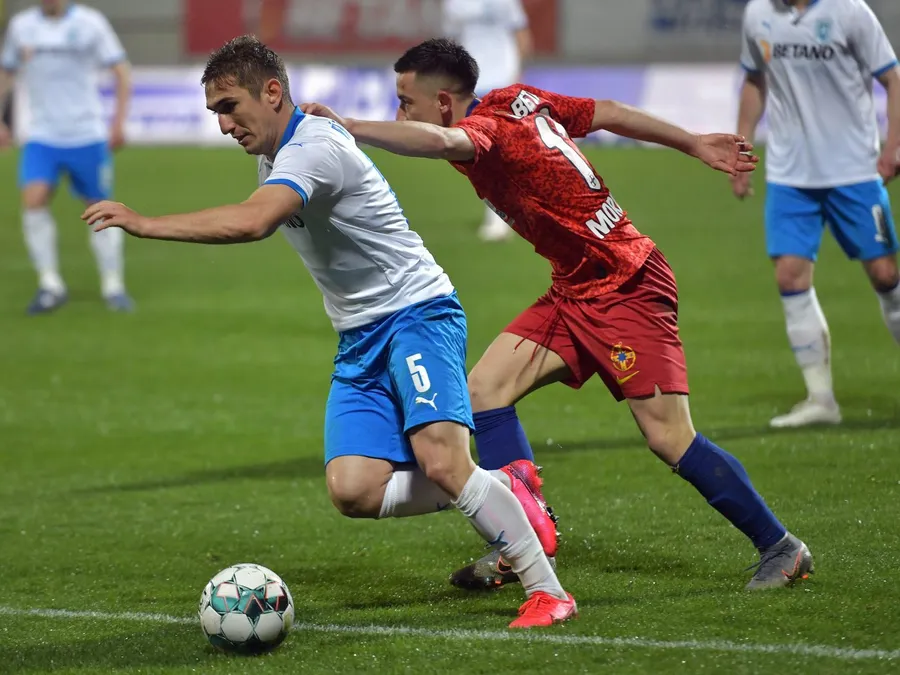 Bogdan Ilie Vatajelu si Olimpiu Vasile Morutan in meciul de fotbal dintre FCSB si Universitatea Craiova, contand pentru Liga 1 Casa Pariurilor, desfasurat fara spectatori pe Stadionul Marin Anastasovici din Giurgiu, duminica 4 aprilie 2021. © FOTO:Razvan Pasarica/SPORT PICTURES