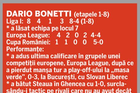 Alegerea lui Dario Bonetti, un antrenor apreciat de fanii „câinilor” în ciuda scurtului său mandat anterior, poate fi și o confirmare tristă pentru acționari. Anume aceea că oricâți antrenori ar fi adus între cele două mandate ale italianului, rezultatele n-au fost deloc pe măsura brandului Dinamo. Cu alte cuvinte, prin rechemarea lui Bonetti, dinamoviștii reiau un proiect ce promitea în 2009, unul care s-a remarcat, cel puțin în viziunea suporterilor, prin organizare tactică, promovarea tinerilor, delimitarea de frații Becali și, nu în ultimul rând, prin rezultate!