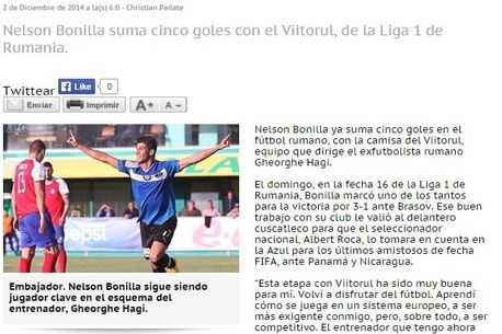 În vârstă de 24 de ani, salvadorianul Nelson Bonilla pare să treacă prin cea mai bună perioadă a carierei la FC Viitorul, acolo unde a devenit o prezență constantă în prima echipă. Atacantul a vorbit în presa din țara sa natală, El Salvador, despre șansa pe care a primit-o în România, una care a marcat și revenirea sa la națională, unde nu mai fusese convocat din 2012: „În România am redescoperit plăcerea de a juca fotbal. Această perioadă de la Viitorul a fost una foarte bună pentru mine. Am învățat să joc într-un sistem european, să fiu mai exigent cu mine, dar mai ales competitiv. Antrenorul pe care îl am acum, Gică Hagi, vrea mereu să câștige”, a declarat cel care pentru Viitorul a marcat, în cele 16 etape, cinci goluri.