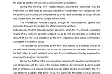 „În cadrul acestei ședințe, reprezentanții FRF au asigurat autoritățile că Federația va lua măsuri în sensul de a introduce sancțiuni disciplinare pentru nerespectarea protocolului privind reluarea competițiilor astfel încât să crească gradul de conștientizare al cluburilor, oficialilor și jucătorilor cu privire la necesitatea respectării normelor impuse. Liga Profesionistă de Fotbal, prin reprezentanții săi, a fost de acord și a susținut această necesitate a introducerii sancțiunilor anterior menționate.