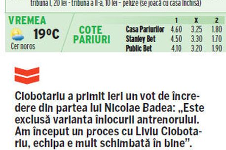 Imediat după meciul cu Luceafărul Oradea, Liviu Ciobotariu a apărut la conferința de presă având mina unui om pus sub presiune, care caută soluții și parcă-și dă seama că nu are unde să le găsească. „Caut soluții pentru benzile terenului, dar azi nici Păun, nici Scărlătescu nu m-au mulțumit. Nu am ce să fac, voi căuta în continuare„, spunea Ciobotariu, care a mai reluat în câteva rânduri de-a lungul discursului ideea jocului slab pe benzi.