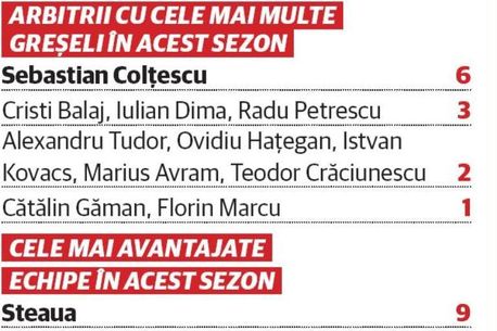 Analizând în profunzime cifrele de mai sus am descoperit faptul că Steaua se numără printre cele mai favorizate trupe din Liga I și, deși mai are două jocuri restante, se află deja pe primul loc în acest clasament. Lider incontestabil în Liga I, echipa lui Laurențiu Reghecampf trebuie să mulțumească pentru acest lucru și arbitrilor. În 11 meciuri disputate până acum (n.r. – Steaua are două restanțe, cu Astra și Concordia), campioana a fost ajutată în cinci dintre ele! În unele chiar de mai multe ori, astfel că Steaua are parte de nouă greșeli pro, majoritatea, cinci, venind din partea olteanului Sebastian Colțescu. „Colțescu putea fi cel mai bun arbitru român la ora actuală, la ce calități are. Dar dacă a ales să ia după unii și după alții e treaba lui”, e de părere fostul șef al CCA, Ion Crăciunescu. La polul opus, cele mai dezavantajate formații din Liga I în acest sezon sunt Oțelul Galați și FC Vaslui, ambele cu patru decizii contra.