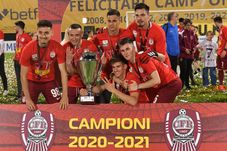 Nicolae Carnat, Valentin Ionut Costache, Rares Mihai Murariu Catalin Mihai Itu, Raul Bogdan Haiduc si Mihai Adrian Gidea pozeaza alaturi de trofeul acordat castigatoarei campionatului in urma meciul de fotbal impotriva celor de la FCSB, contand pentru Play-off-ul Ligii 1 Casa Pariurilor, desfasurat pe Stadionul Dr. Constantin Radulescu din Cluj Napoca, marti 25 mai 2021. © FOTO:Razvan Pasarica/SPORT PICTURES