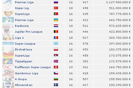 Topul este dominat de Premier League (Anglia), Primera Division (Spania) și Serie A (Italia), cu valori de 3.3 miliarde de euro, 2.6 miliarde de euro, respectiv 2.14 milarde de euro.