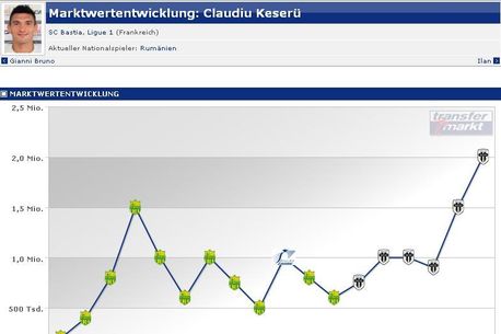 Explozia din ultimul an s-a cuantificat și într-o creștere a cotei jucătorului, care a ajuns în acest sezon să înregistreze cel mai mare nivel: 2 milioane de euro este cota actuală a lui Keșeru pe transfermarkt.de