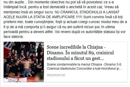 După meci, fostul realizator TV, care este crainic al Concordiei Chiajna de peste șase ani, a explicat situația pe contul personal de Facebook.