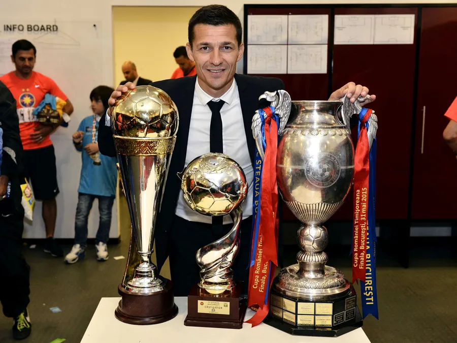 Costel Galca pozeaza alaturi de cele 3 trofee cucerite (Cupa Ligii, Cupa Ligii 1 și Cupa Romaniei)