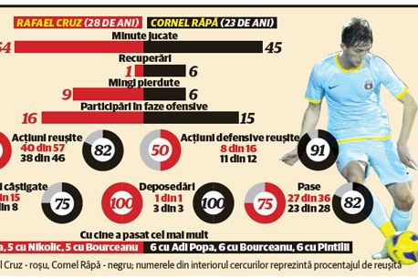 Rafael Cruz a jucat 54 de minute contra lui FC Basel. Cornel Râpă doar 45, contra lui Ferencvaros. Ambii pe postul problemă, cel de fundaș dreapta. În ceea ce privește acțiunile reușite, brazilianul a reușit numai 40 din 57 (70%), în timp ce românul 38 din 46 (82%). Râpă l-a bătut pe Cruz și la capitolul dueluri câștigate (75% față de numai 40%), la pase exacte (82% față de 75%), dar și la deposedări (3, față de numai una în dreptul lui Cruz). Mai mult, Cornel Râpă a pierdut numai șase mingi atât timp cât a fost pe teren, în timp ce Rafael Cruz a pierdut nouă, iar la capitolul recuperări, fostul oțelar a fost excelent, cu șase recuperări față de una în dreptul lui Cruz.