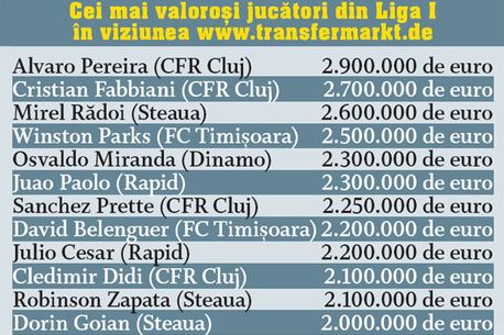 Potrivit site-ului transfermarkt.de, lotul echipei din Gruia are o valoare de piață de 34 de milioane de euro, cu 6,5 milioane mai mult decât Rapid și cu 7,05 milioane de euro peste Steaua. „Am pe mână cel mai valoros lot cu care am lucrat vreodată”, spunea vara trecută Ioan Andone, după primul cantonament cu CFR Cluj. Vorbele tehnicianului au primit confirmare și din partea unuia dintre cele mai cunoscute site-uri de analiză a pieței jucătorilor, www.transfermarkt.de. Infuzia de transferuri din această vară a făcut ca, pentru prima oară în istoria de 100 de ani, CFR Cluj să aibă, potrivit transfermarkt.de, cel mai valoros lot de jucători din România, evaluat la 34 de milioane de euro. Vestea l-a bucurat pe președintele campioanei, Iuliu Mureșan, convins că evaluarea este corectă. „Estimarea este una corectă. Eu de mult am spus că noi avem cel mai valoros lot din Liga I. Cred că valoarea echipei va crește după ce vom participa în Liga Campionilor. Normal ar fi să se dubleze”, a apreciat Mureșan.