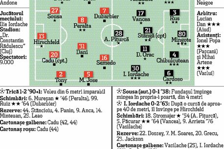 Nou-intratul Ruiz (75) poate relansa meciul, dar voleul său din centrul careului se lovește de transversală. Trică marchează pe final, dar fluierul de sfârșit al lui Lucian Dan aduce deznădejdea la Cluj. Odată cu ea și primii fiori că echipei lui Andone îi scapă titlul printre degete.