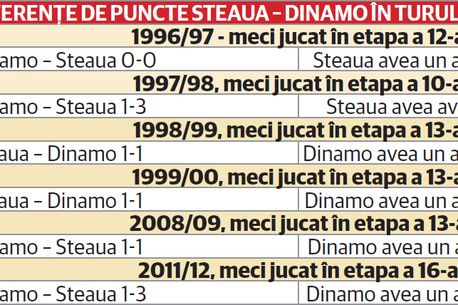 ProSport a făcut analiza tuturor campionatelor de la introducerea sistemului care premiază o victorie cu trei puncte, iar rezultatul este unul măgulitor pentru steliști. Roș-albaștrii n-au mai disputat niciun derby cu Dinamo în turul campionatului pe care să-l abordeze având o diferență așa mare față de rivali. Până acum, Steaua – Dinamo, cu trupa din Ghencea în avans, s-a jucat cu steliștii la maximum cinci puncte de „câini”. Prima dată, în 1996, în etapa a 12-a, când s-a terminat 0-0, iar apoi chiar în sezonul următor, când formația lui Stoichiță a învins cu 3-1 în etapa a 10-a.
