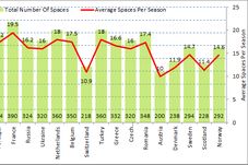 Studiul continuă prin calculul raportului format din numărul total de locuri disponibile în fiecare ligă împărțit la numărul de echipe diferite care au activat în acestea în ultimii 20 de ani. România este prima, cu 2,99 echipe pe loc. Așadar, în Liga 1 au activat 52 de cluburi diferite pe o medie de 17,4 locuri disponibile.