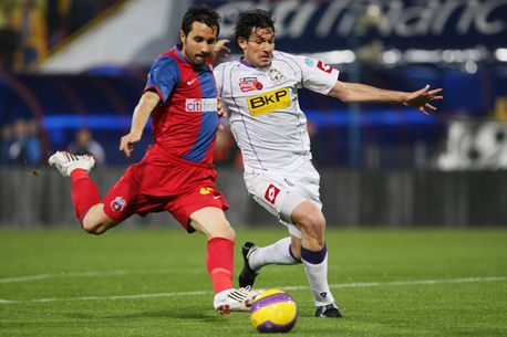 Min.43 Steaua domină acest final de repriză: Pleșan trimite un șut-centrare de pe partea dreaptă care le dă mari emoții timișorenilor dar mingea s-a dus peste transversală