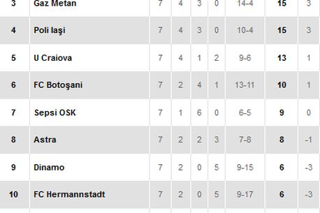 FCSB ocupă locul 14 în Liga 1, după primele șapte etape. Dinamo a învins Hermannstadt, scor 3-0, astfel că a evadat din subsolul clasamentului. Pe ultima poziție a picat FCSB, care a piedut ultimele cinci jocuri din campionat.